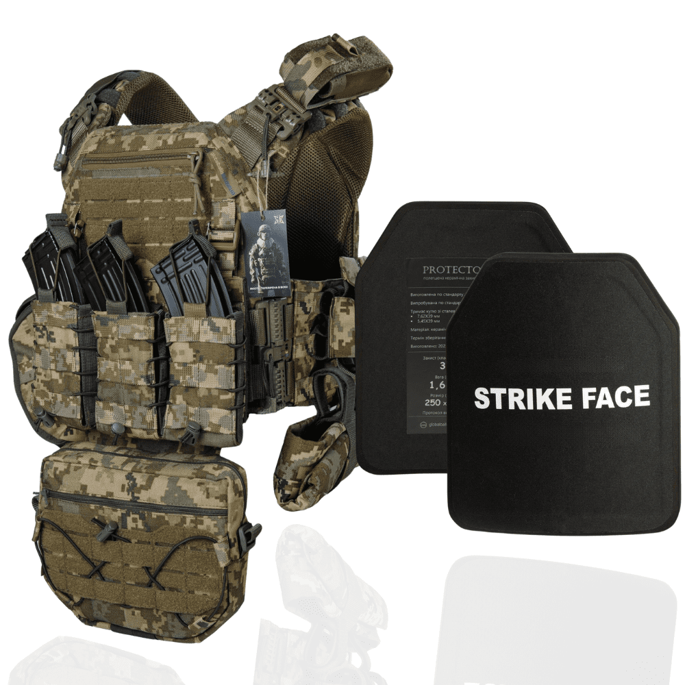 Найлегший варіант бронежилету, що в змозі захистити вас від пострілу 5.45 (якщо бути точним, то від 5,45 х 39 мм. ПС та 7,62 х 39 мм. ПС.), але в більшості випадків його обирають не із-за цього, він в першу чергу захистить вас від найбільш розповсюдженого ушкодження – від ураження уламками різної величини, хвиль вибухів та рикошетів. В комплекті бронежилету: дві бронеплити 3-го класу захисту (вага кожної 1.7 кг.) та плитоноска (PRO) покращена із системою швидкого скидання, супер мʼякими підплічниками та матеріалу CORDURA 1000.