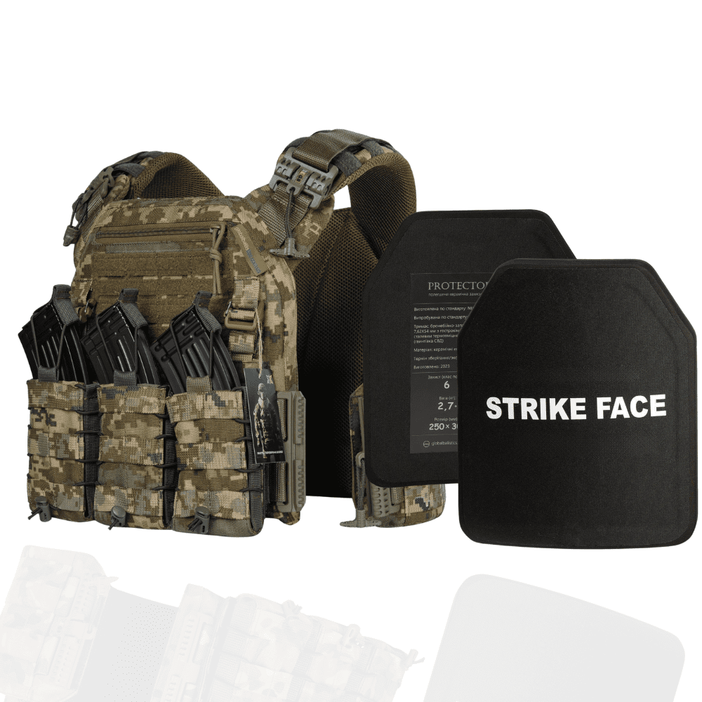 Міцний та надійний варіант бронежилету (6 клас по ДСТУП або NIJ IV по світовій класифікації) при вазі всього 6.2 кг. В комплект входить: дві керамічні бронеплити 6-го класу захисту (вага кожної 2.8 кг.) та плитоноска Warmor Gen. 3 покращена із системою швидкого скидання, супер м’якими підплічниками та матеріалу CORDURA 1000. Саме в такому комплекті броні виконують свої завдання спец підрозділи армії США, Франції, Британії та ін.