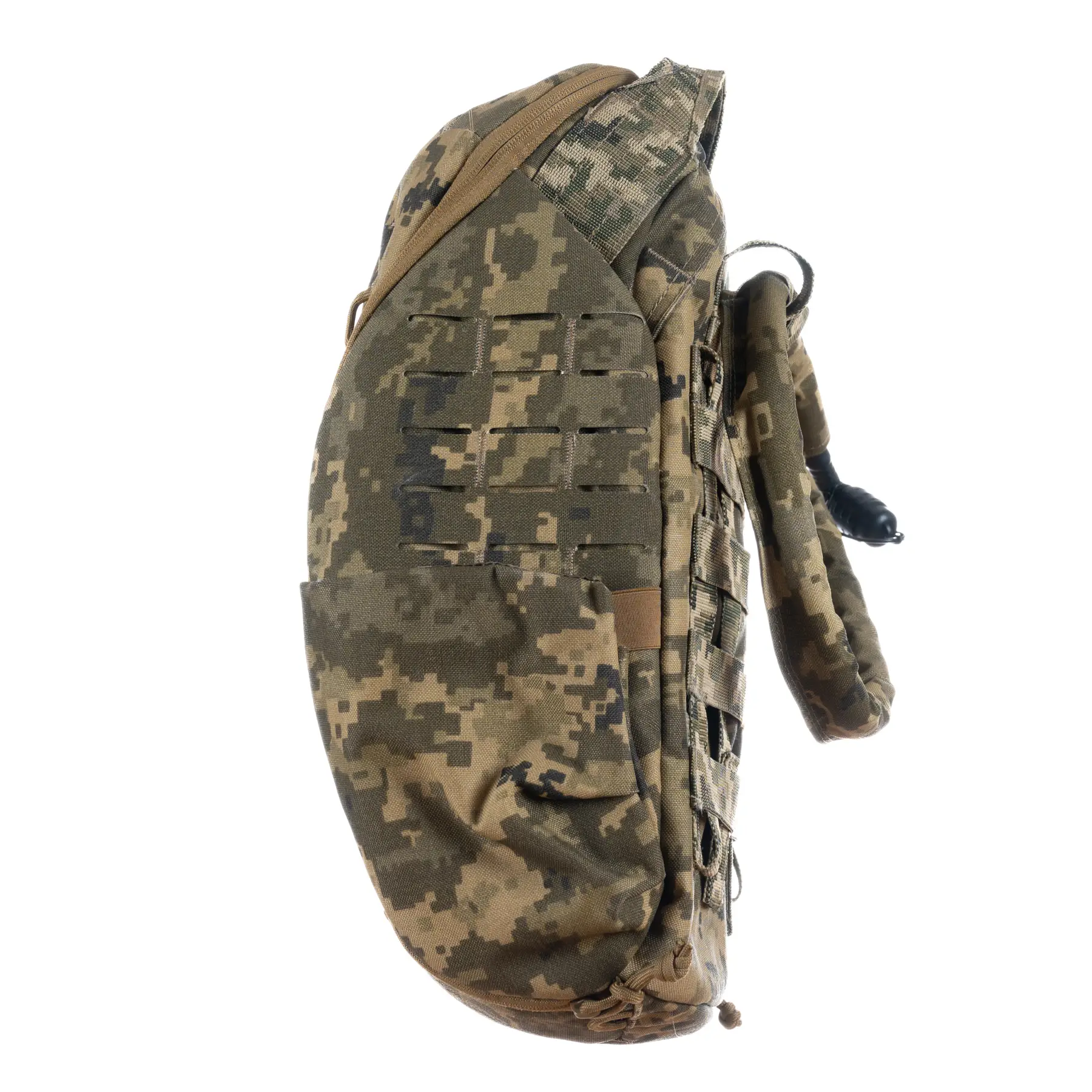 Рюкзак кріпется на плитоноску завдяки системі MOLLE, він надійно тримається на 4х стропах так не заважає рухам.
