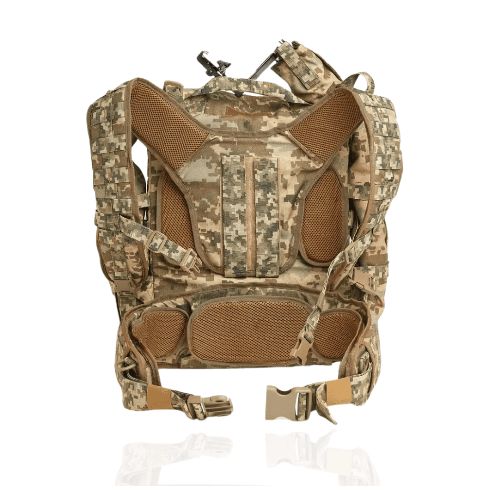 4. Тактична платформа з плечовими лямками, яка виступає “носієм” рюкзака з коробом. Платформа містить стропи PALLS і може бути використана для встановлення будь-якого іншого спорядження, що сумісне з PALLS. Можливе використання окремо без рюкзака з боєзапасом;