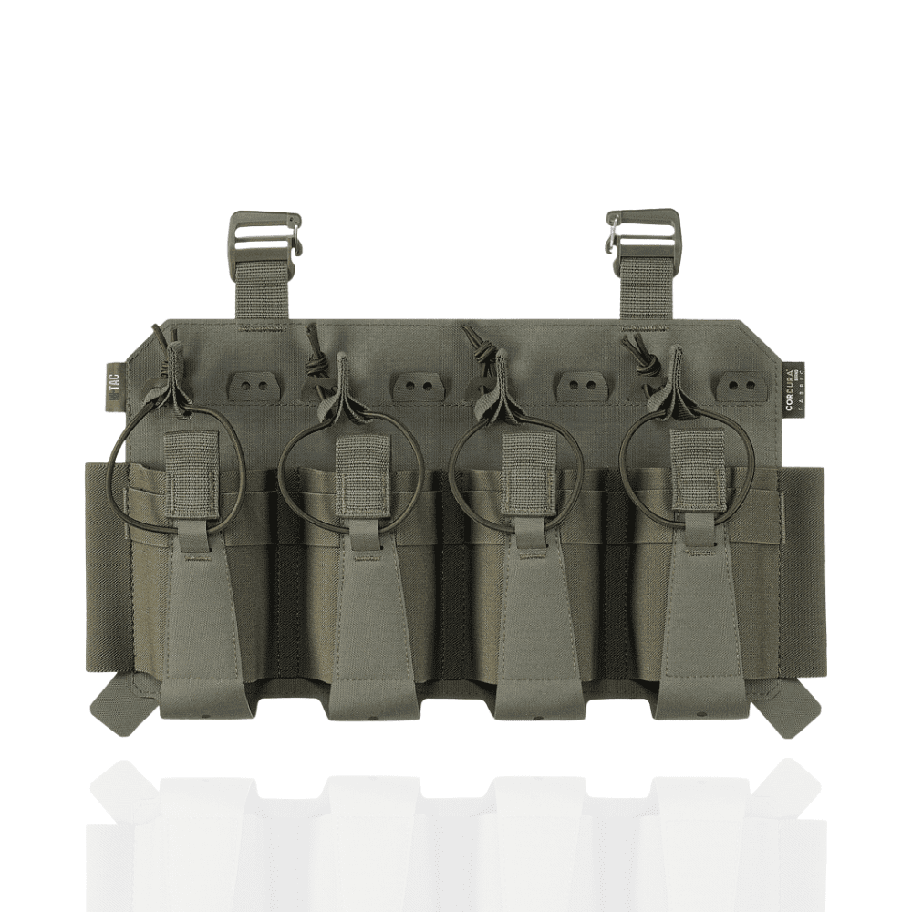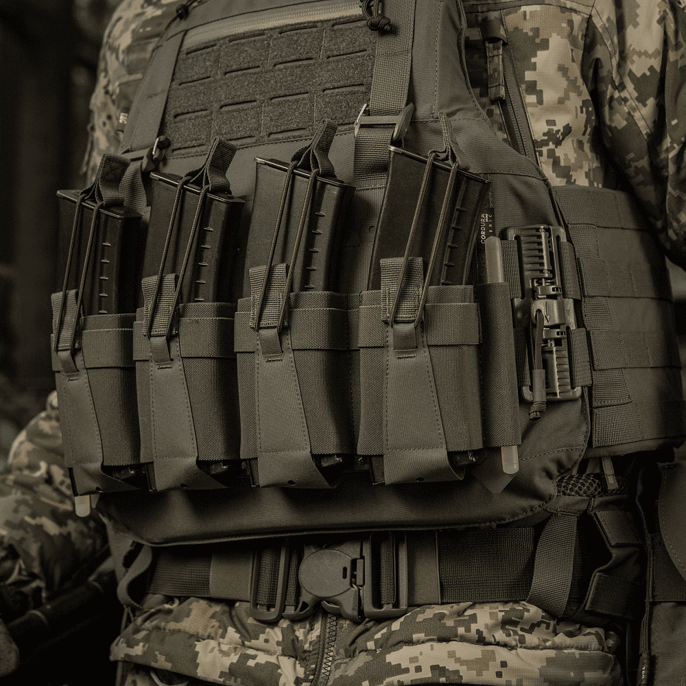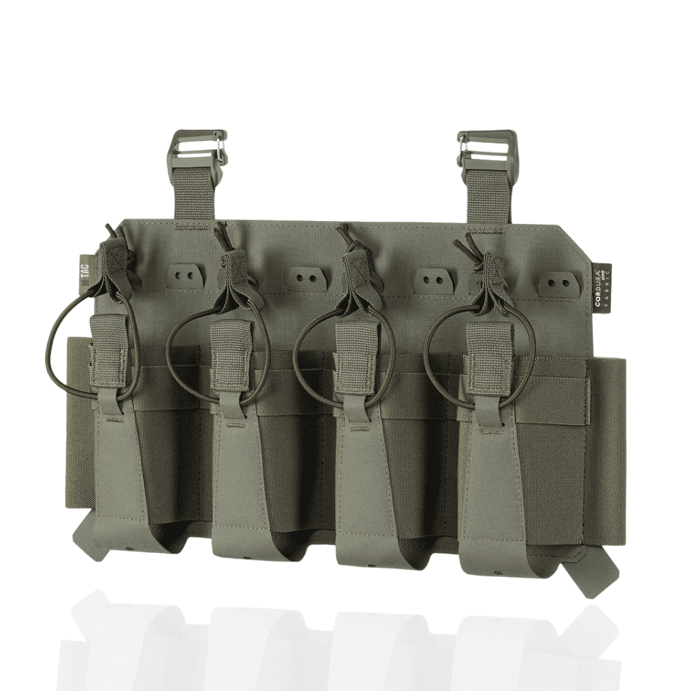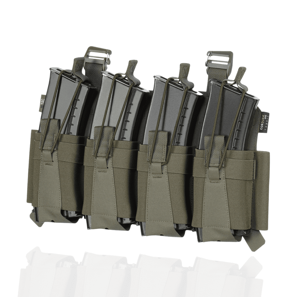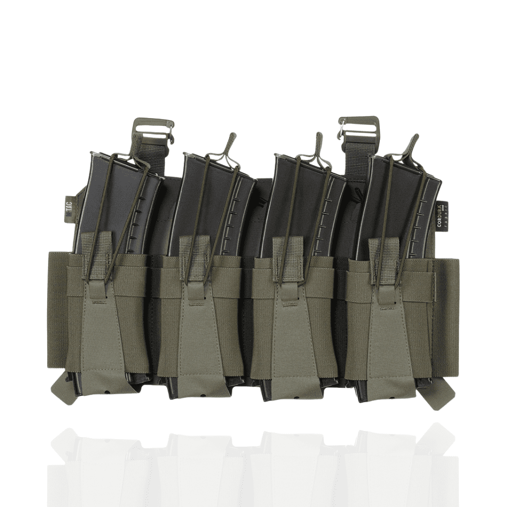 Виготовлений з еластичної резинки у поєднанні з Cordura Squadron – високотехнологічним матеріалом, стійким до стирання та високих навантажень. Система фіксації магазинів здійснюється за допомогою еластичної резинки та страхової стропи з «вушками», що забезпечують надійний захист від випадання.