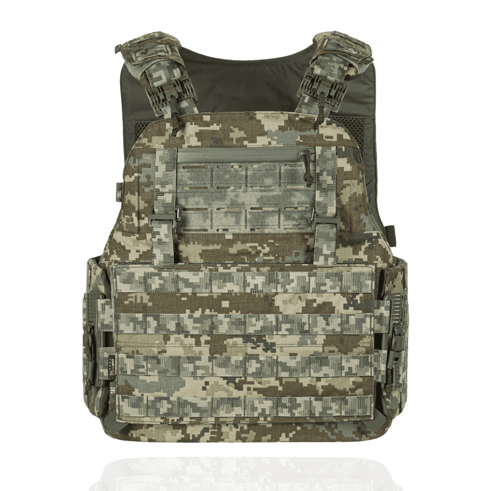 Спереду чохол бронежилета оснащений спеціальною Molle панеллю, яка зроблена по технології Laser Cut і дозволяє зручно розмістити підсумки, кобури, аптечки, органайзери та інше спорядження. Щоб уникнути випадкового зривання з основи Velcro, вона кріпиться до строп на чохлі за допомогою карабінів Woojin.