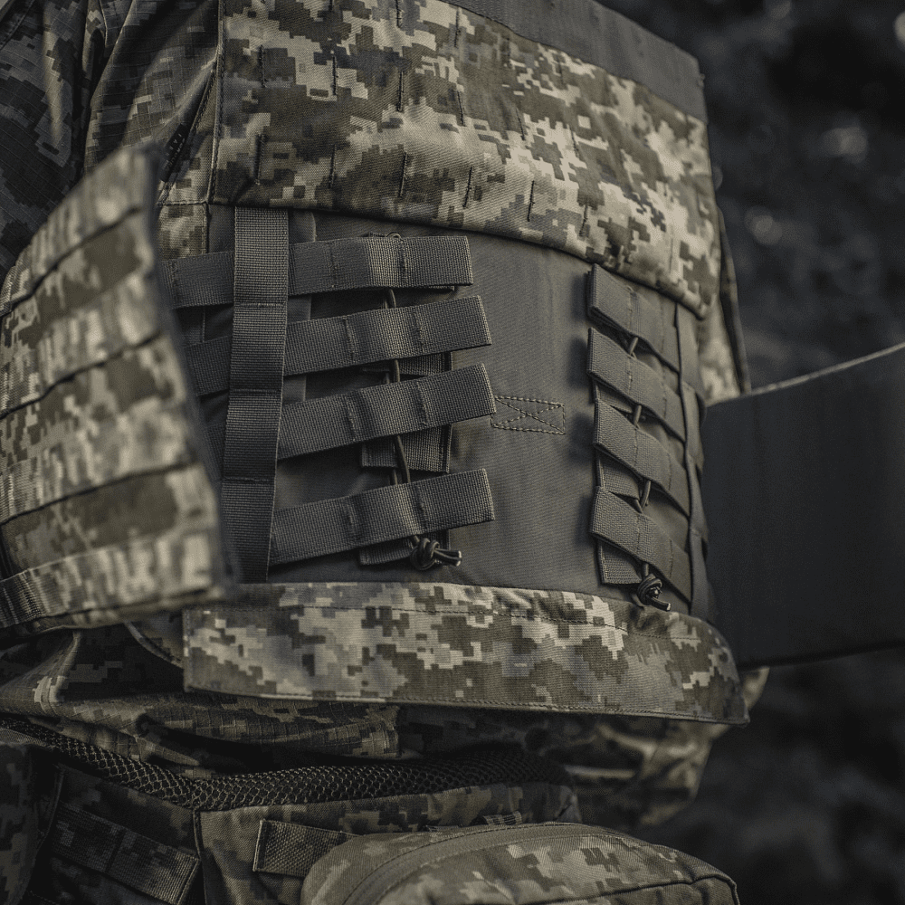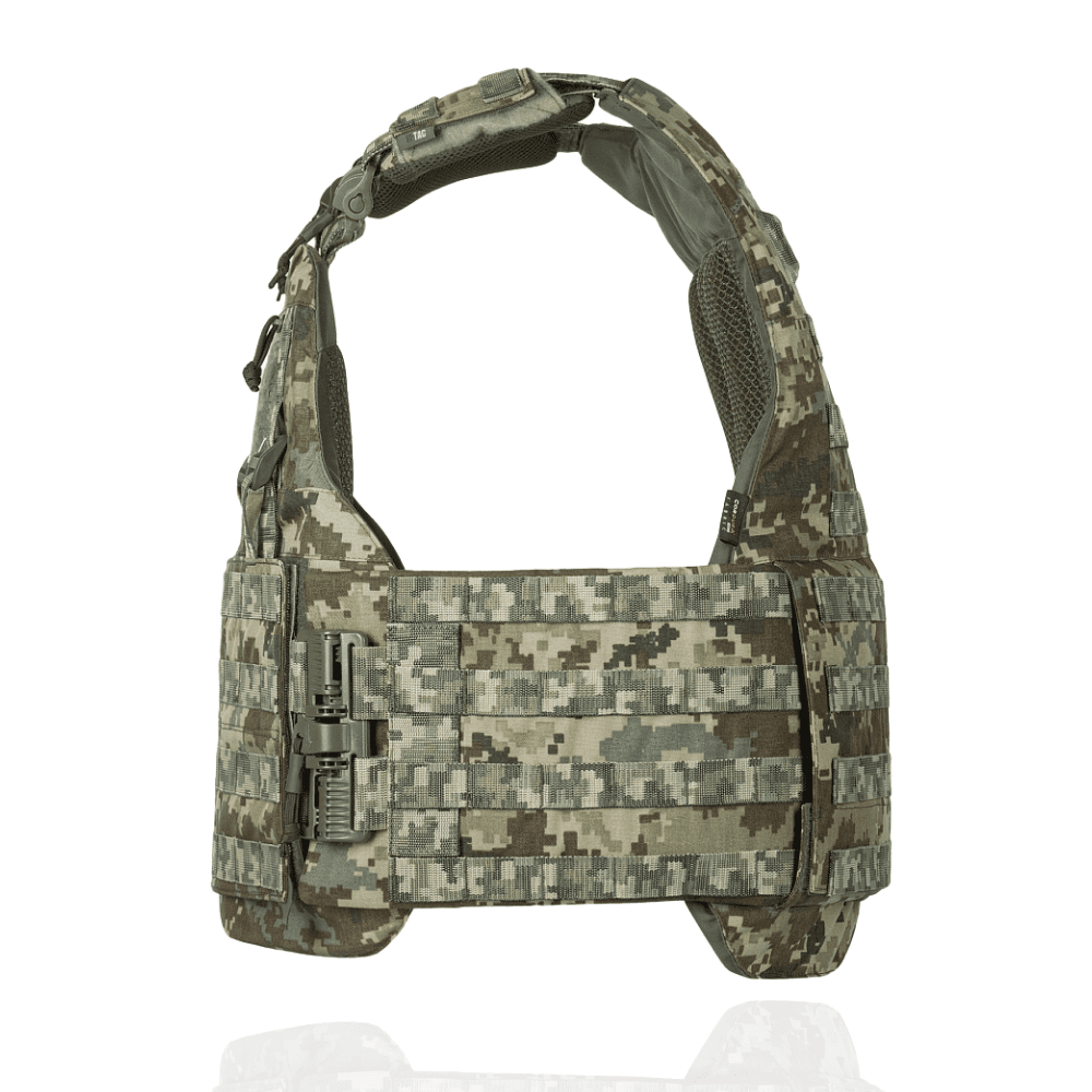 На задній панелі виробу – класичний MOLLE-інтерфейс, у верхній частині якого розташована евакуаційна стропа, яка з рекомендацій військових була посилена спеціальними закріпками. З внутрішньої сторони по всій площині грудного та спинного відділів дизайнери бренду передбачили вставки з 3D сітки та спеціальні демпферні пади, що забезпечують амортизацію та відмінну циркуляцію повітря.