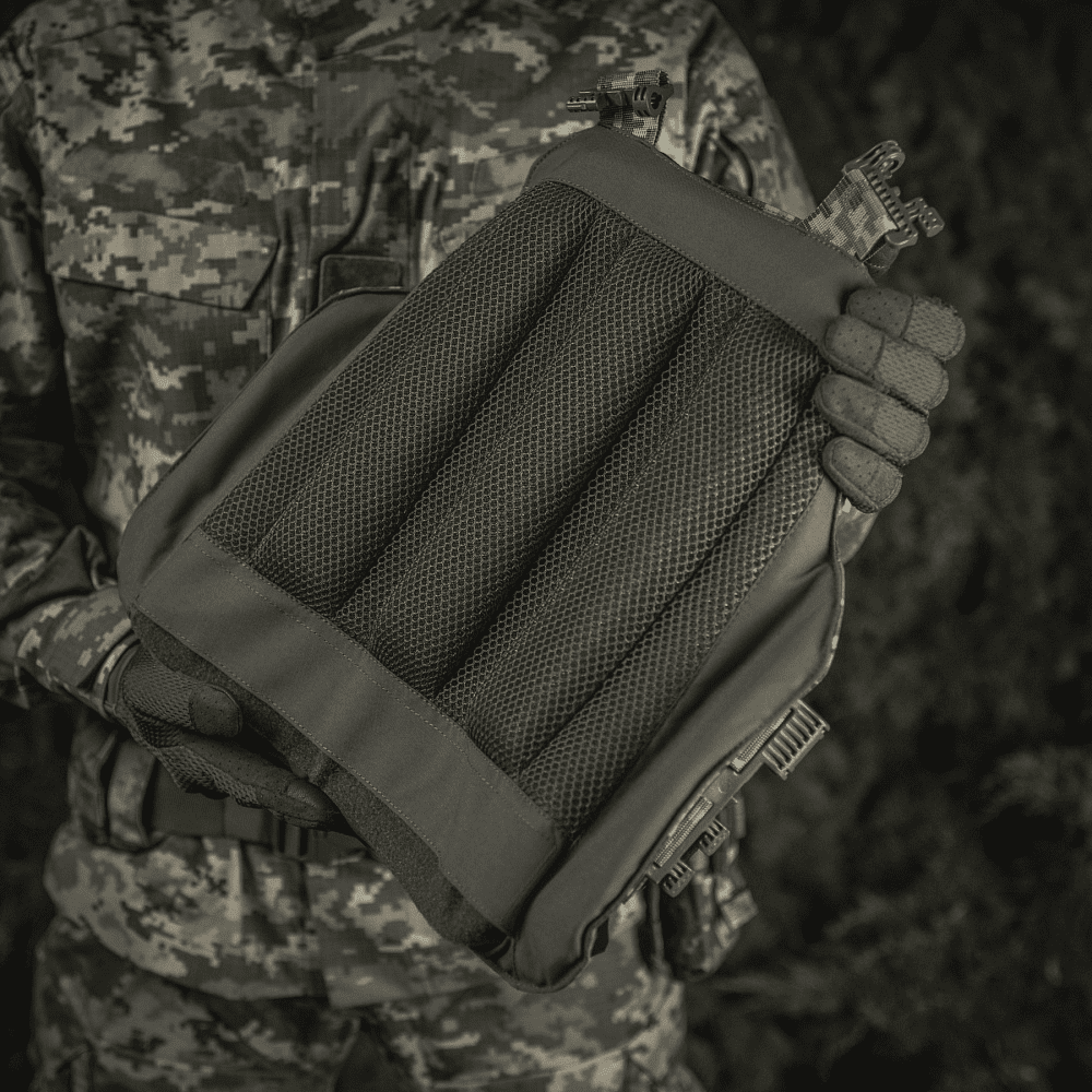 Даний виріб сумісний зі стандартними бронеплитами ESAPI (USA) Medium (31.8 х 24.1 см), Large (33.7 х 26 см) та Extra Large (35.5 х 28 см). За допомогою внутрішньої еластичної резинки та спеціальних строп ви зможете легко налаштувати його під розмір потрібної вам плити.