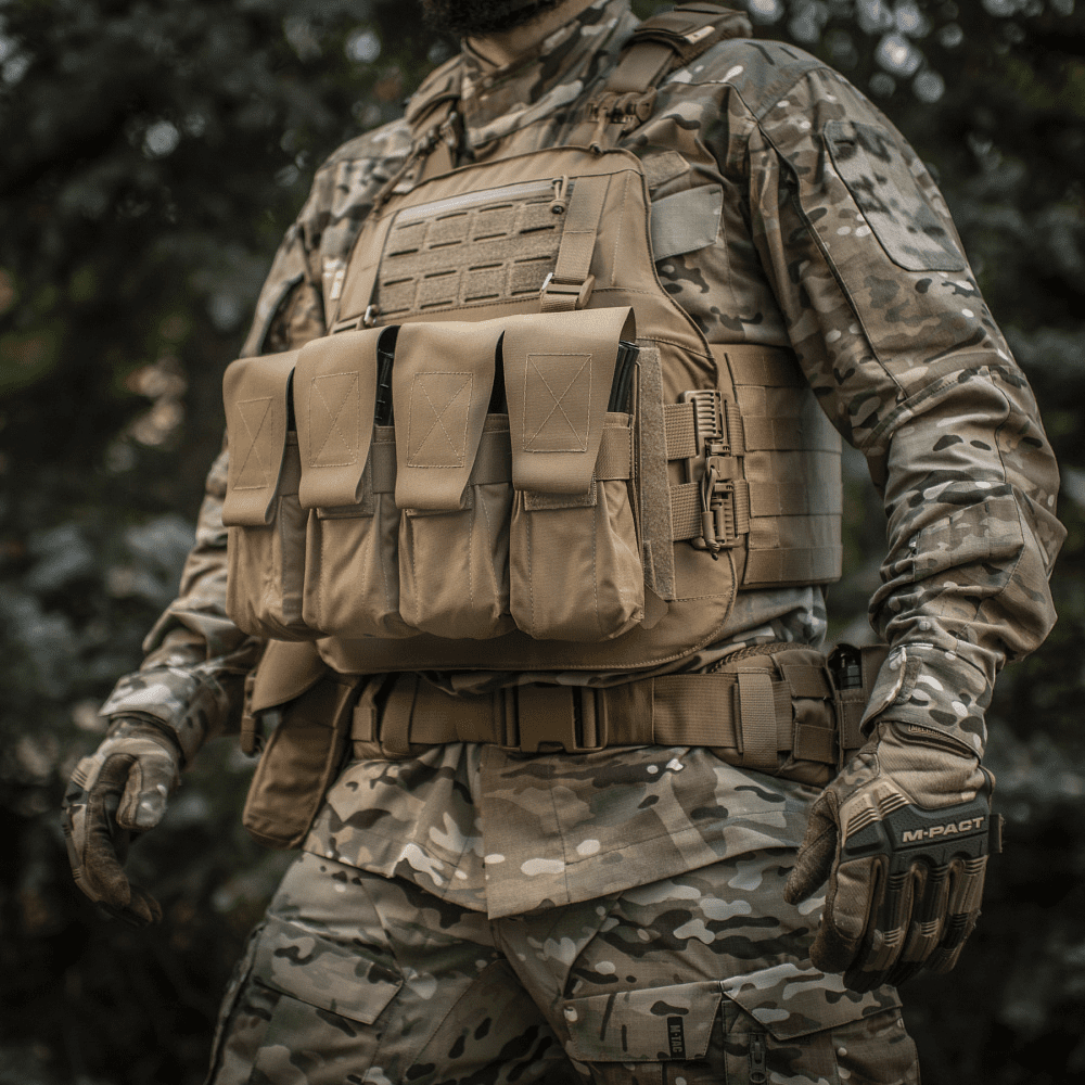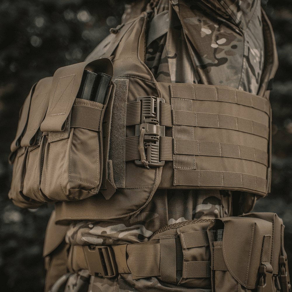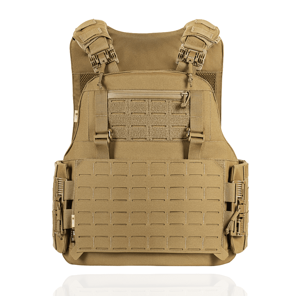Спереду чохол бронежилета оснащений спеціальною Molle панеллю, яка зроблена по технології Laser Cut і дозволяє зручно розмістити підсумки, кобури, аптечки, органайзери та інше спорядження. Щоб уникнути випадкового зривання з основи Velcro, вона кріпиться до строп на чохлі за допомогою карабінів Woojin.