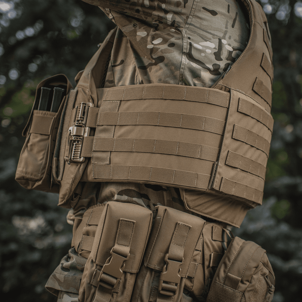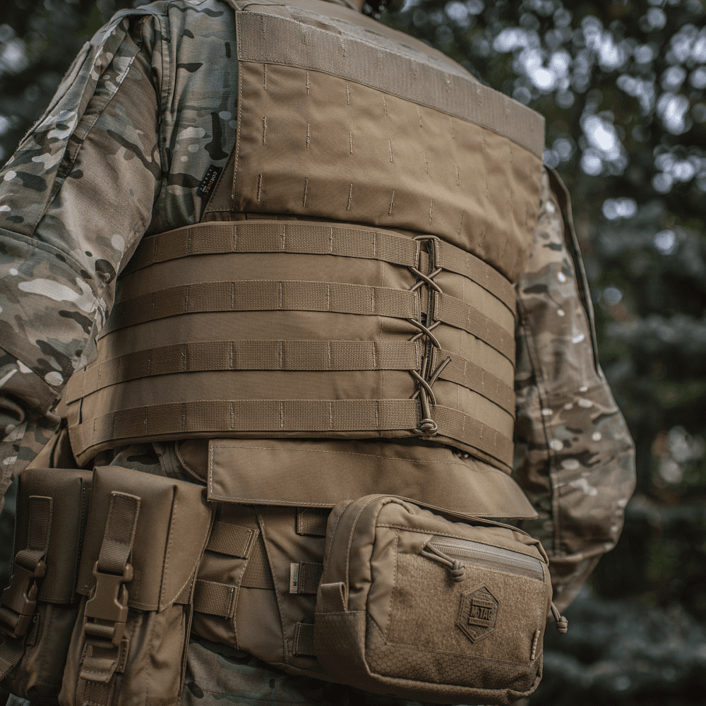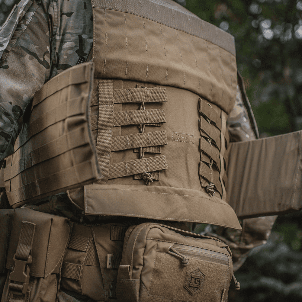 Чохол бронежилета виготовлений з високоякісного матеріалу Cordura 500D – надміцної тканини, стійкої до стирання і високих навантажень. Розширений камербанд з Molle інтерфейсом на 4 стропи при необхідності дозволяє розмістити додаткове спорядження, наприклад, горизонтальні аптечки або утилітарні підсумки.