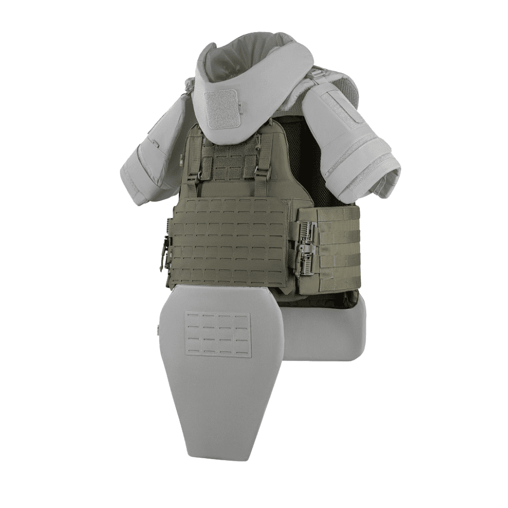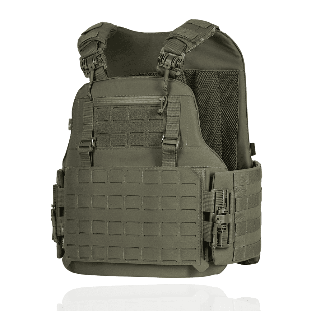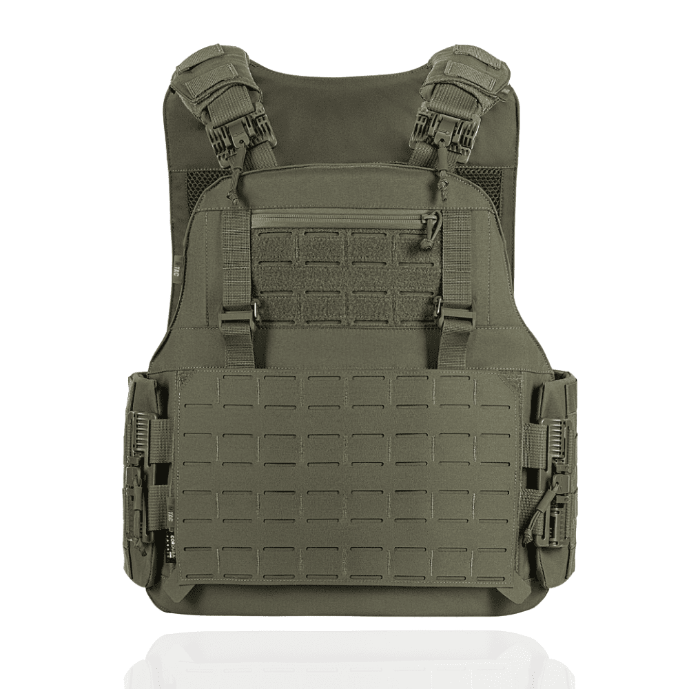 Спереду чохол бронежилета оснащений спеціальною Molle панеллю, яка зроблена по технології Laser Cut і дозволяє зручно розмістити підсумки, кобури, аптечки, органайзери та інше спорядження. Щоб уникнути випадкового зривання з основи Velcro, вона кріпиться до строп на чохлі за допомогою карабінів Woojin.