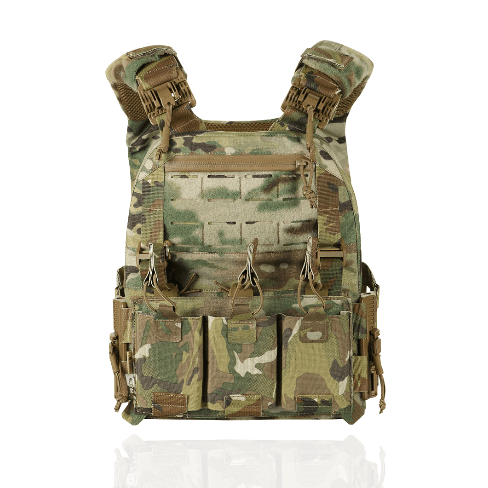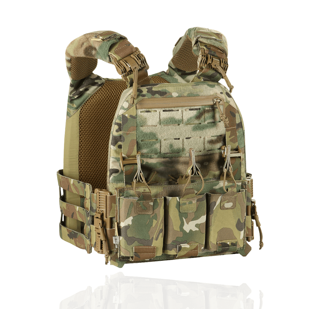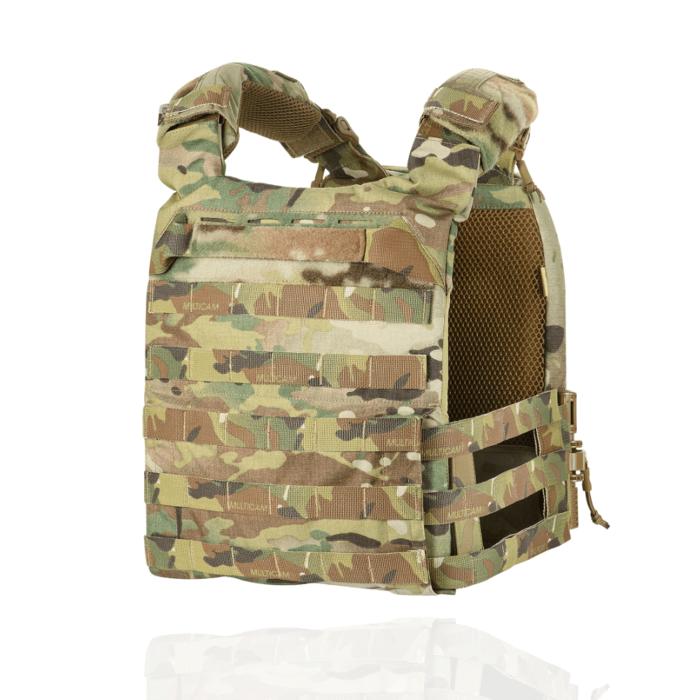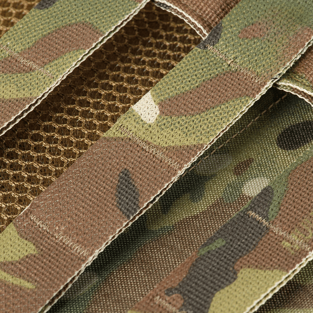 Плитоноска виготовлена з високоякісного матеріалу Cordura 500D – надміцної тканини, стійкої до стирання і високих навантажень. З внутрішньої сторони є вставки з 3D сітки, які забезпечують амортизацію та циркуляцію повітря. Ергономічні плечові лямки зручні у використанні й органічно повторюють контури тіла. Скелетоподібний камербанд значно зменшує вагу виробу і при необхідності дозволяє розмістити підсумки.