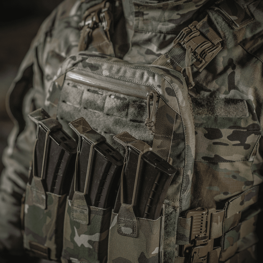 Знизу бронежилета знаходиться швидкозніма панель з 3 підсумками, які надійно утримують магазини. Щоб уникнути випадкового зривання з основи Velcro, вона кріпиться до строп на плитоносці за допомогою карабінів Woojin.