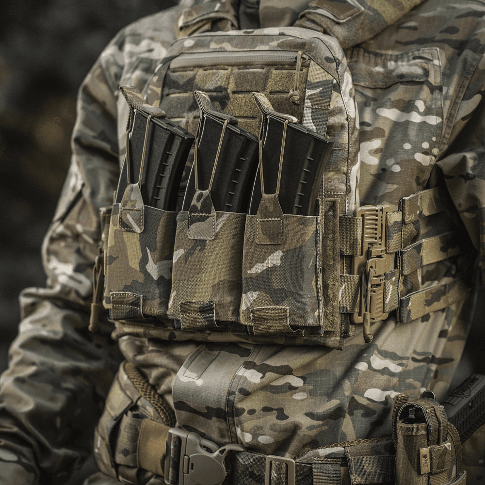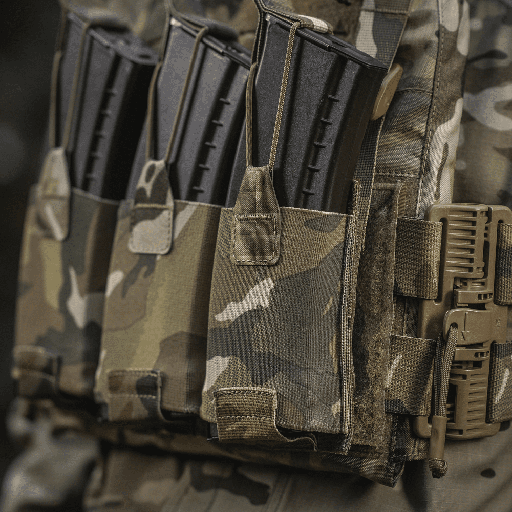 Знизу бронежилета знаходиться швидкознімний модуль з 3 підсумками, які надійно утримують магазини. Щоб уникнути випадкового зривання з основи Velcro, він кріпиться до строп на плитоносці за допомогою карабінів Woojin.