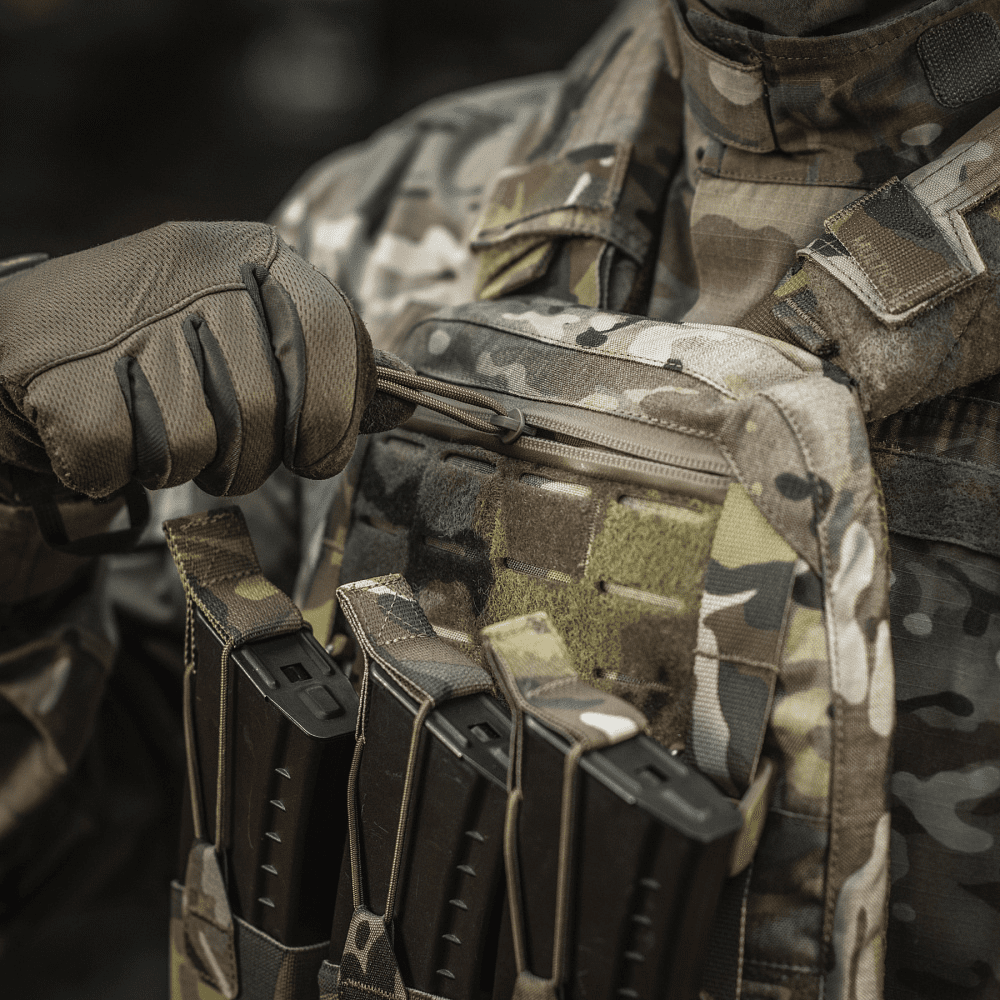На фронтальній частині виробу знаходиться Velcro-панель з прорізами, на яку можна закріпити молле-сумісне спорядження та ID-ідентифікатори. Вгорі плитоноски дизайнери бренду передбачили невелике адміністративне відділення на вологозахисній блискавці AquaGuard. Дана кишеня розрахована на зберігання невеликих плоских речей, таких як посвідчення, ключі, запальничка та інші предмети.
