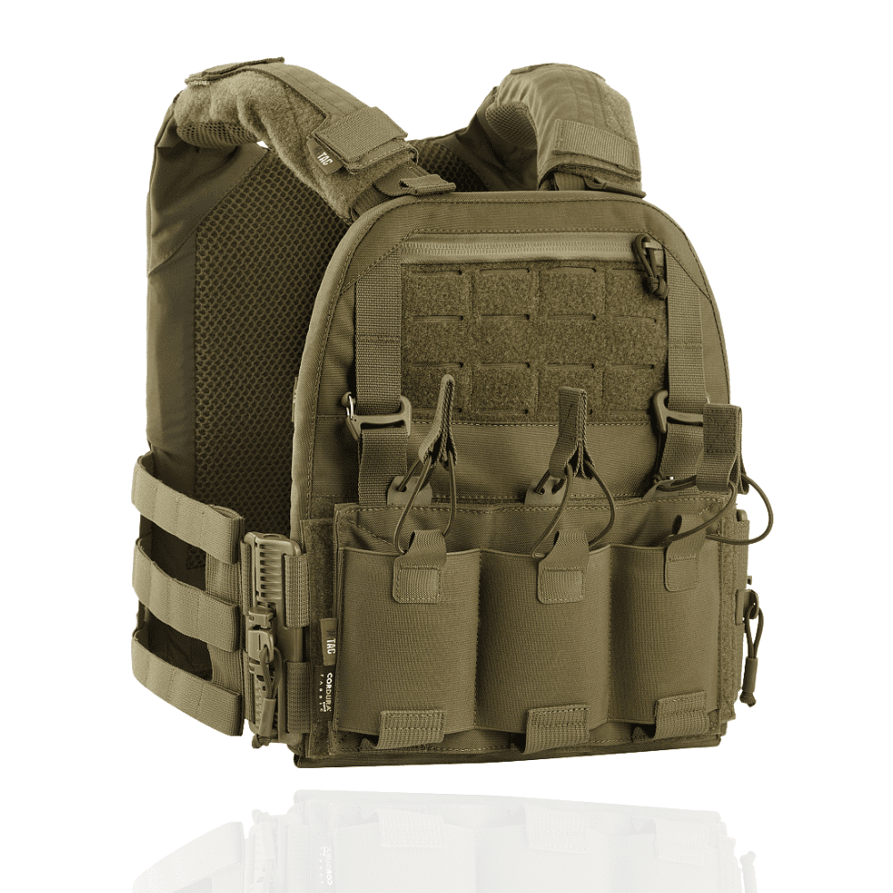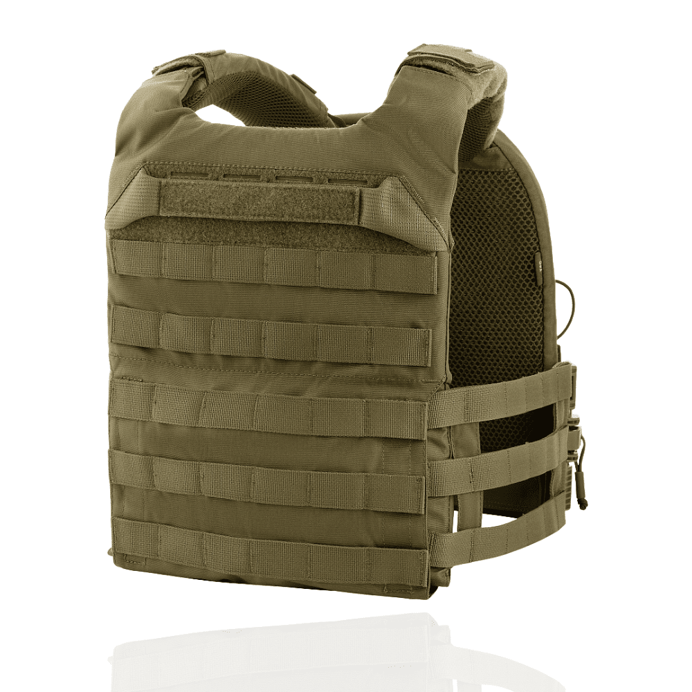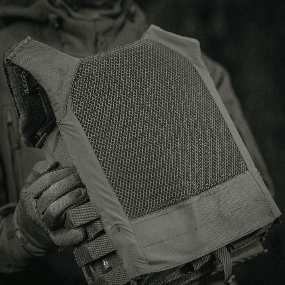 Виготовлена з високоякісного матеріалу Cordura 500D – надміцної тканини, стійкої до стирання і високих навантажень. З внутрішньої сторони плитоноски є вставки з 3D сітки, які забезпечують амортизацію та циркуляцію повітря. Ергономічні плечові лямки зручні у використанні й органічно повторюють контури тіла. Скелетоподібний камербанд значно зменшує вагу виробу і при необхідності дозволяє розмістити підсумки.