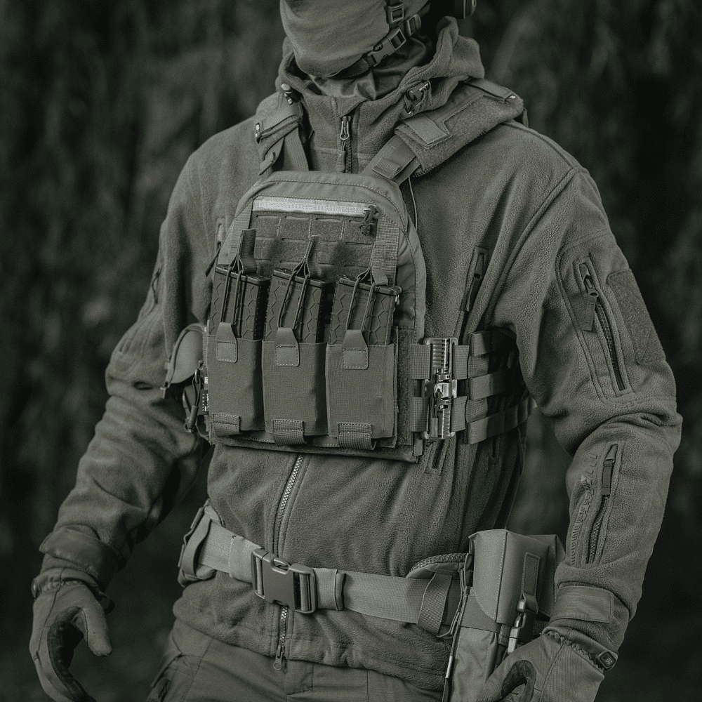 Знизу бронежилета знаходиться швидкознімний модуль з 3 підсумками, які надійно утримують магазини. Щоб уникнути випадкового зривання з основи Velcro, він кріпиться до строп на плитоносці за допомогою карабінів Woojin