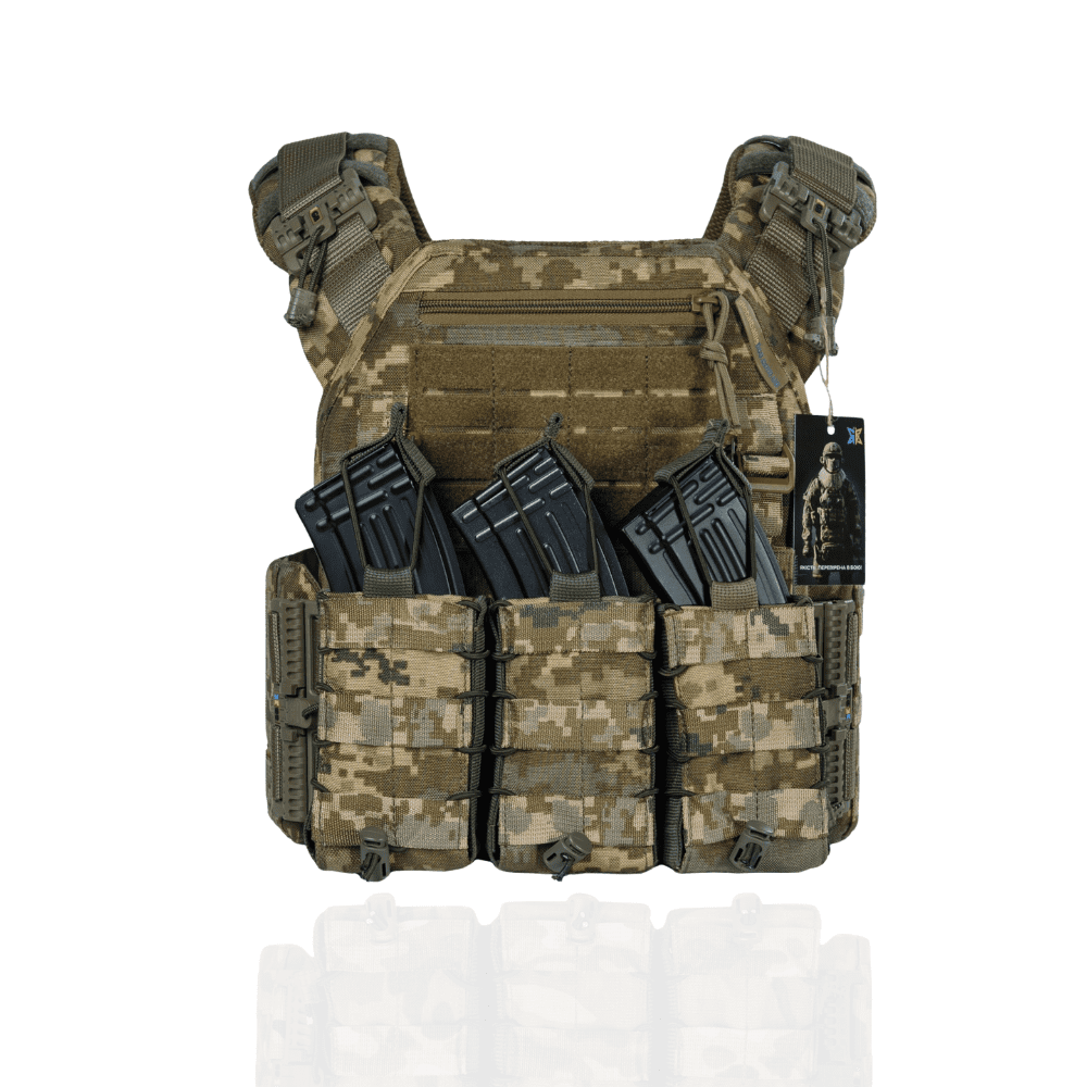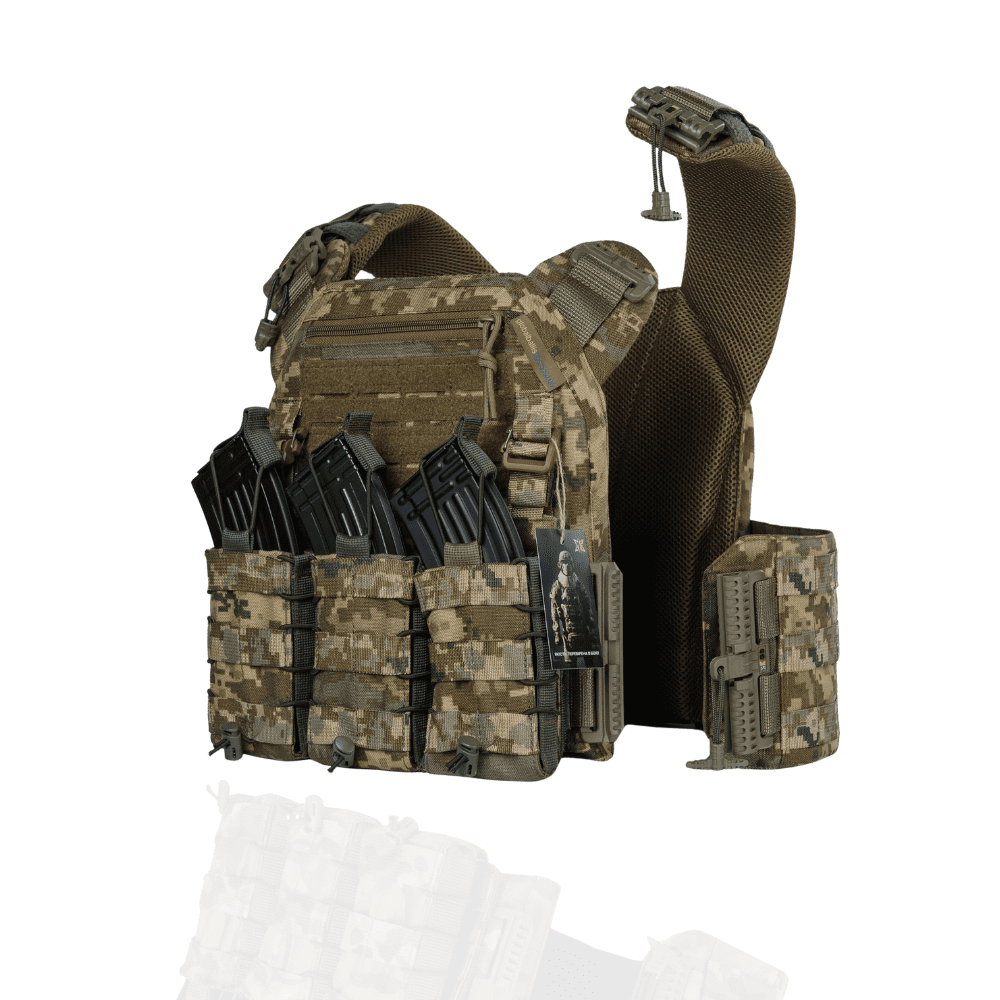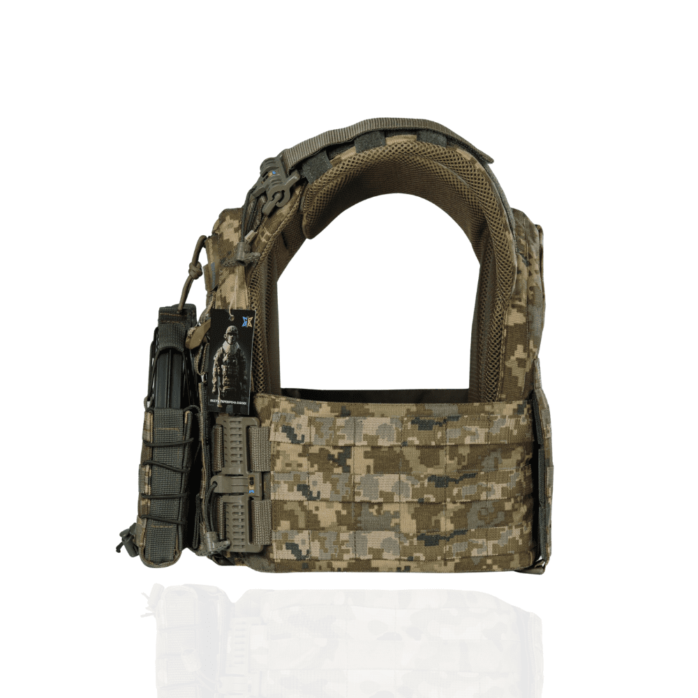 Тактичний жилет – плитоноска може нести балістичні пластини стандартного розміру 250Х300мм, які якісно кріпляться подвійним фіксуванням. Весь жилет обклеєний стрічками в камуфляжній системі MOLLE, що допускає будь-яку конфігурацію (підсумки під магазини, аптечку, сумку скиду і т.д.). На плечиках є «підйомники», що дозволяють позиціонувати та фіксувати балістичні пластини по висоті. Боковини надійно тримаються на липучках і мають можливість встановлення бокового балістичного пакету. Завдяки простій конструкції, заснованій на шести елементах – передній панелі, задній панелі, 2-х поясах, 2-х комфортних плечиках і швидкоз’ємній фурнітурі, що використовується, у Вас є можливість швидкого скидання жилету за 1 сек. Внутрішня частина жилету виконана дистанційною сіткою, що підвищує комфорт при носінні.