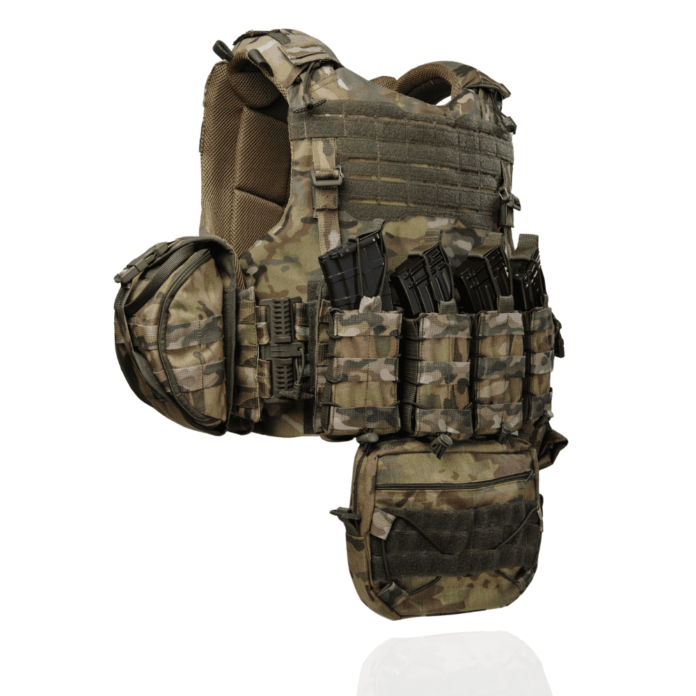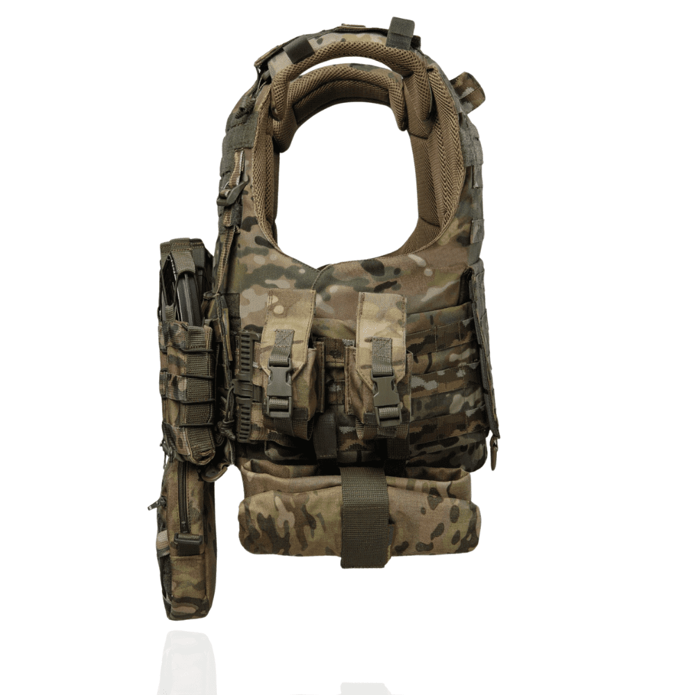 Тактичний жилет – плитоноска може нести балістичні пластини стандартного розміру 250Х300 чи 270х340, 270х350, 300х350 які якісно кріпляться подвійним фіксуванням. Весь жилет обклеєний стрічками в камуфляжній системі MOLLE, що допускає будь-яку конфігурацію (підсумки під магазини, аптечку, сумку скиду і т.д.). Плитоноска має збільшену площу обтяження тіла бійця, завдяки чому, вставивши балістичний м’який захист, можна максимально збільшити площу захисту від уламків. На плечиках є «підйомники», що дозволяють позиціонувати та фіксувати балістичні пластини по висоті. Боковини надійно тримаються на липучках і мають можливість вставки бокового балістичного пакету. Завдяки простій конструкції, заснованій на чотирьох елементах – передній панелі, задній панелі, 2-х комфортних плечиках і швидкоз’ємній фурнітурі, що використовується, у користувача є можливість швидкого скидання жилету за 1 сек. Внутрішня частина жилету виконана дистанційною сіткою, що підвищує комфорт при носінні.